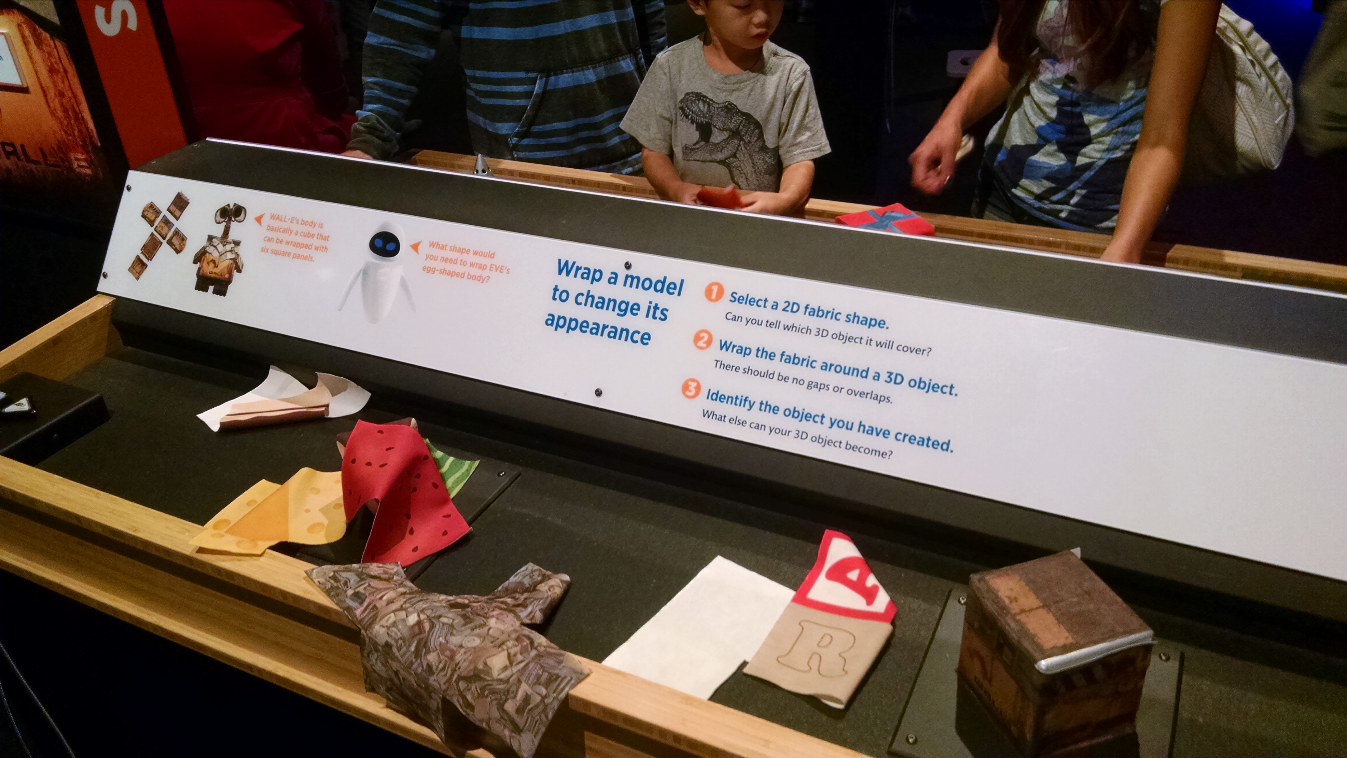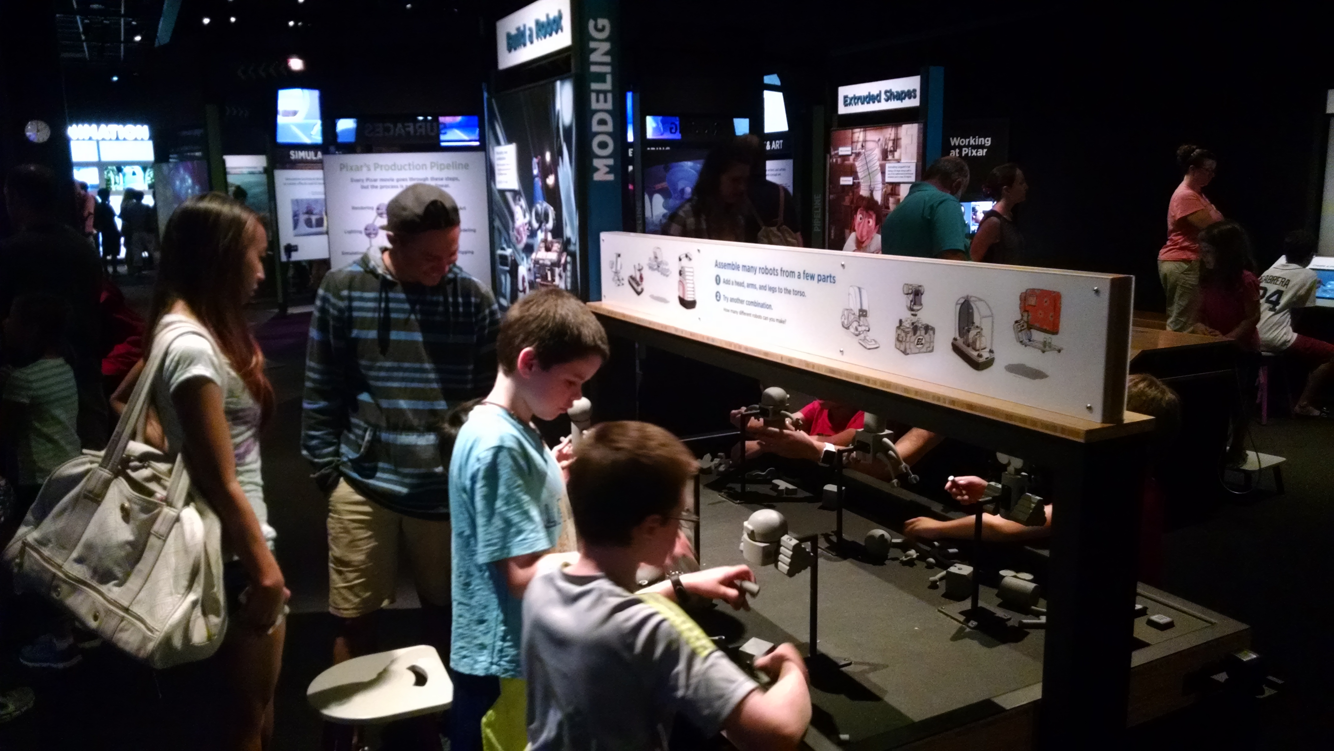 The only time I thought their physical-embodiment of something being described on screen *didn’t* work was in the reconstruction of the coil-within-coil physics of Merida’s hair. The two sets of springs they modeled were equally non-springy, and didn’t really emulate the physics being illustrated at that station. I wanted some dangling slinkies to play with of different materials and construction, instead of standing coils that didn’t move. Otherwise, the physical/virtual pairings were quite impressive.
