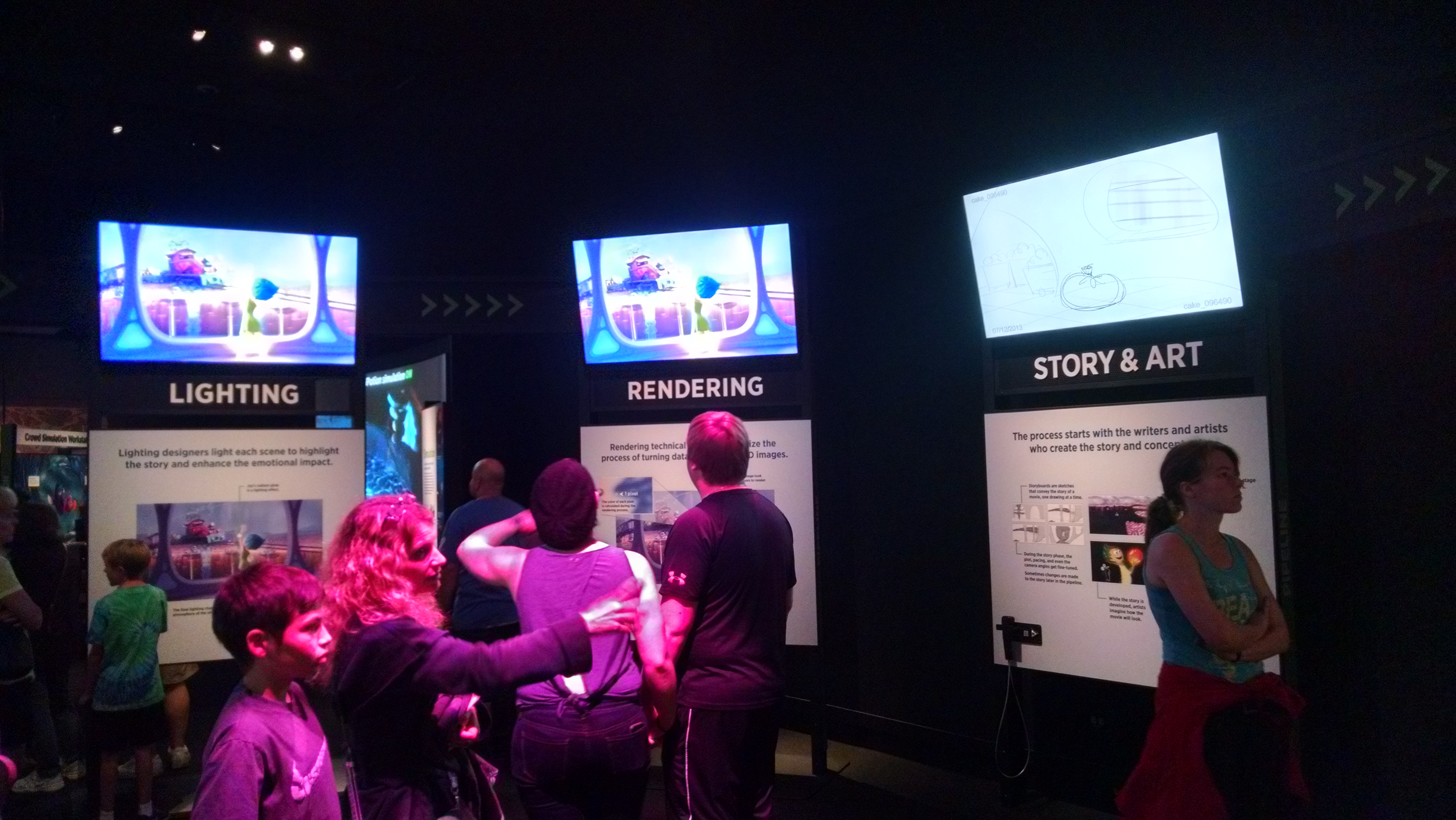 This is an exhibit that doesn’t really have an A-B-C flow; given the amount of bouncing around one has to do to find a free monitor or interactive once it gets busy, that’s a good thing. It is initially a little hard to figure out, but once you hit the ‘process in the round’ area that shows you how often elements of a movie move back and forth between the steps (from character design to rendering to animation to sets back to character design and then to lighting, for example), it makes the forth-and-back of the exhibit ‘map’ less troublesome.