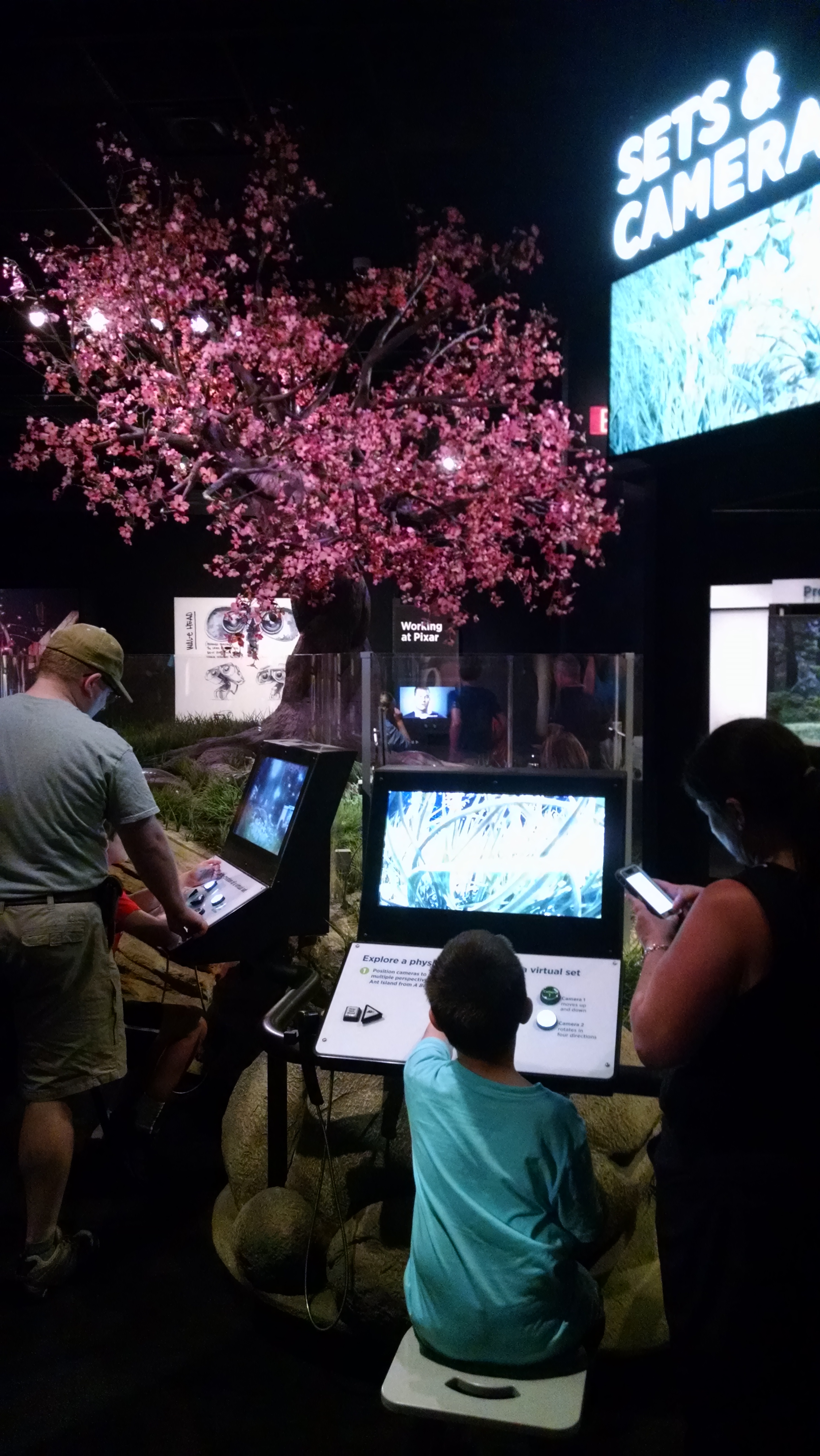 This station allowed you to play with camera angles from several different cameras, and also allowed you to physically climb underneath for a literal bug’s eye view of the constructed set. Simple, effective, great presentation value, and a nice way to tie in both the research Pixar did ahead of A Bug’s Life and the directorial choices available when all your cameras are virtual.