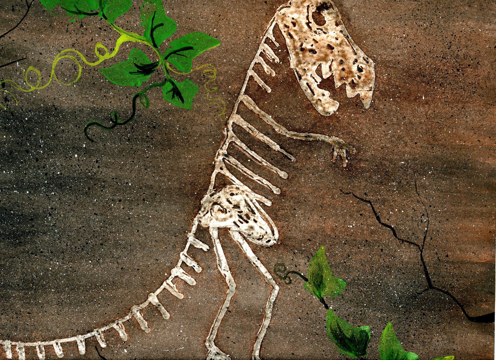 Dinosaur fossil art created with the 'glue-resist' technique. Credit to Gail Bartel. See link below.